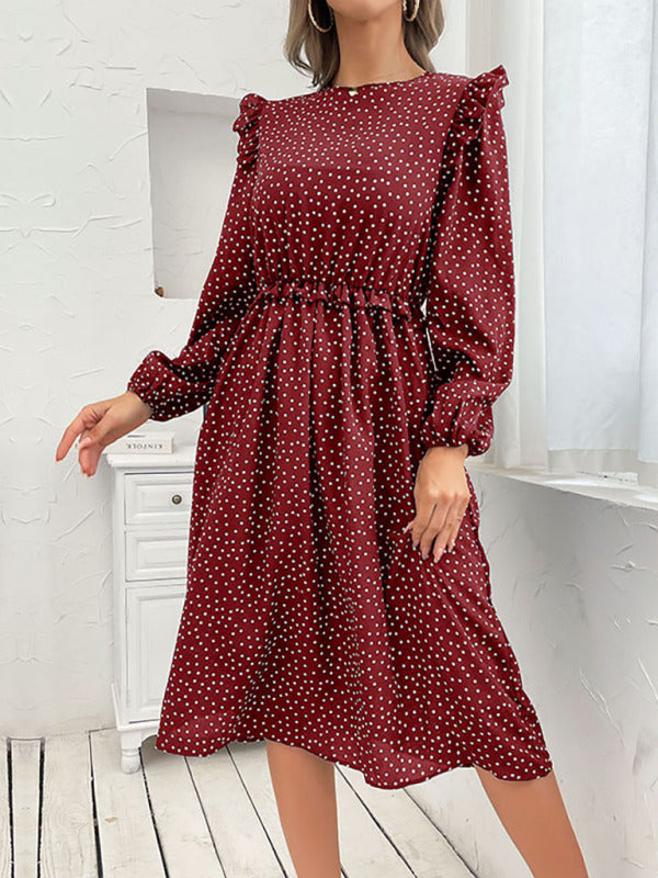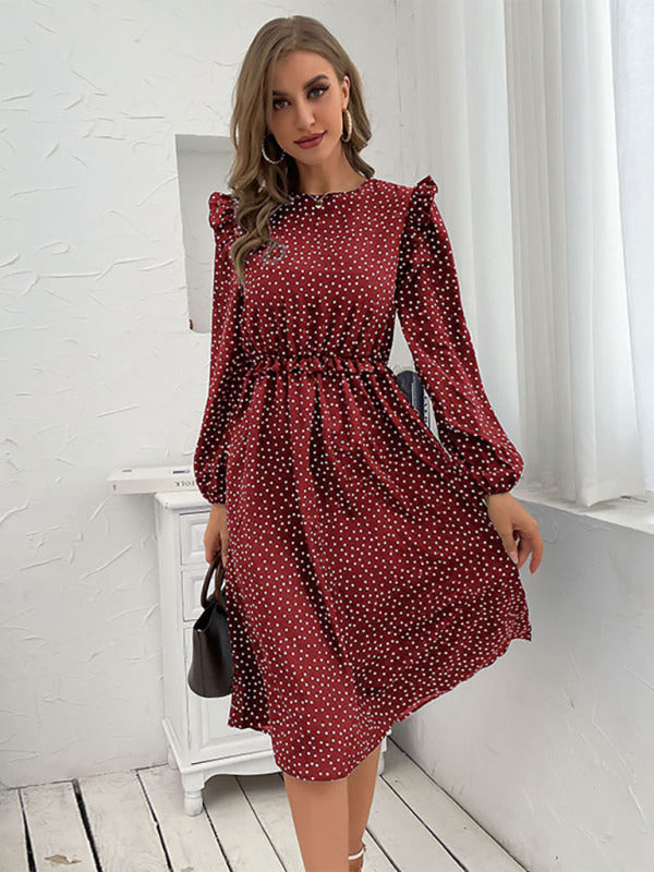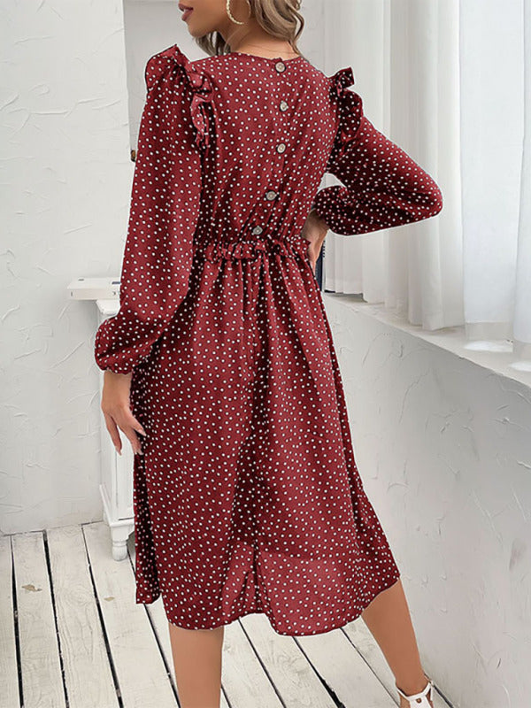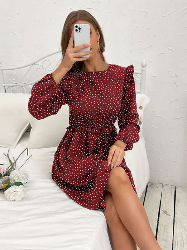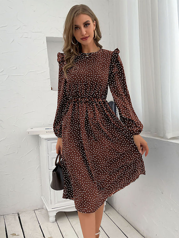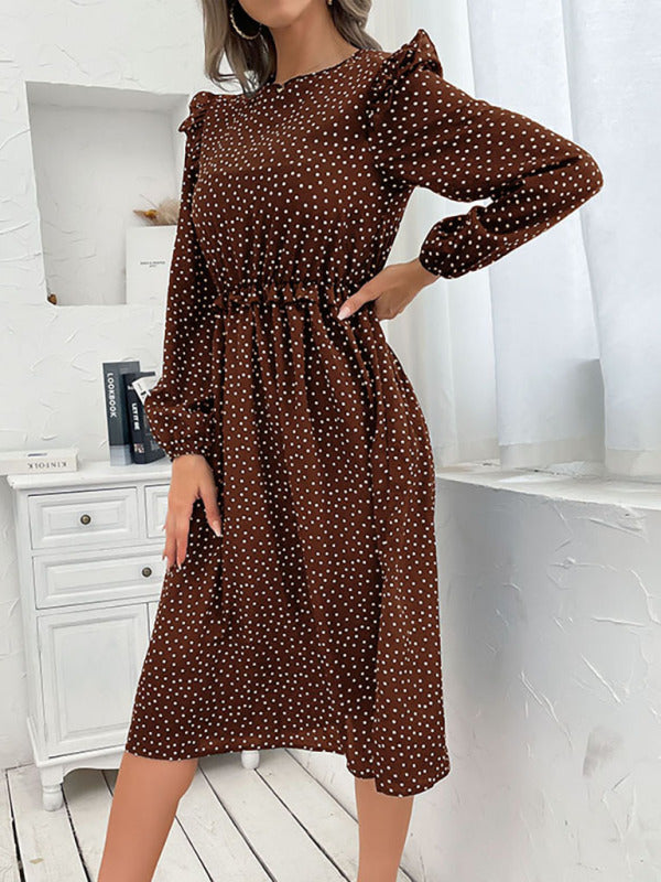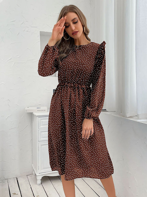 Women's ruffle polka dot long sleeve dress - Coffe / S está agotado y se enviará tan pronto como vuelva a estar disponible.