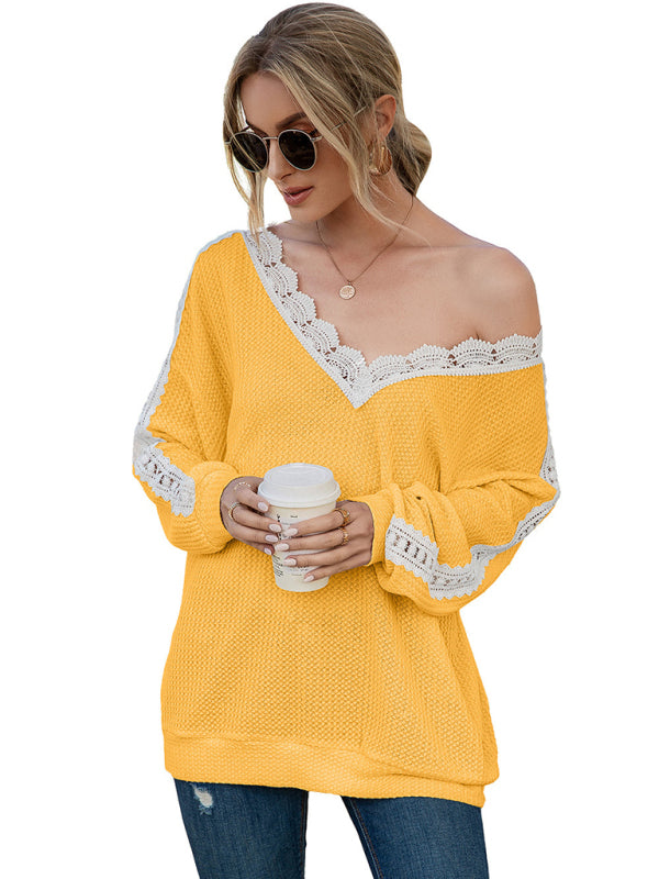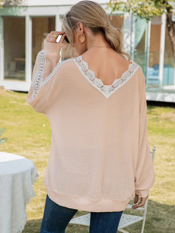 Women's Solid Color Cutout Lace Panel Waffle V-Neck Top