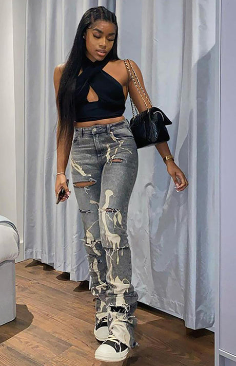 $32.91 USDPrecio unitario /AgotadoStreet fringe high elastic pencil pants mid-rise cropped pants ripped jeans