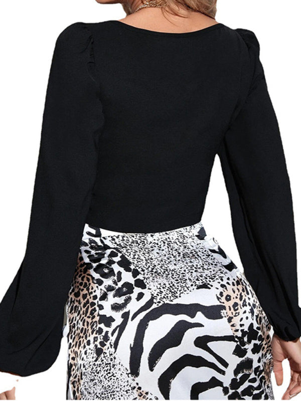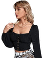 Women's bubble sleeve collar buckle long sleeve top - Black / XS está agotado y se enviará tan pronto como vuelva a estar disponible.