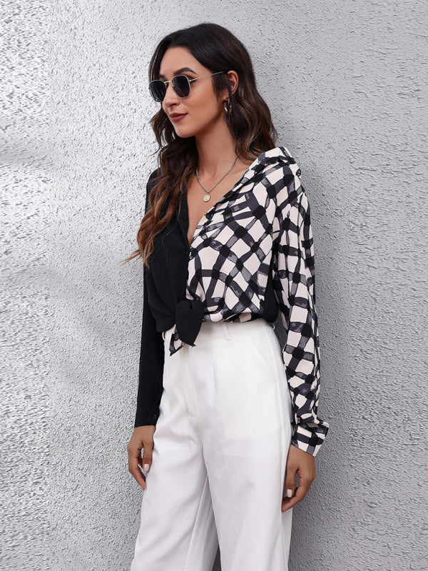 Women's Plaid stitched bubble sleeve Long Sleeve Shirt