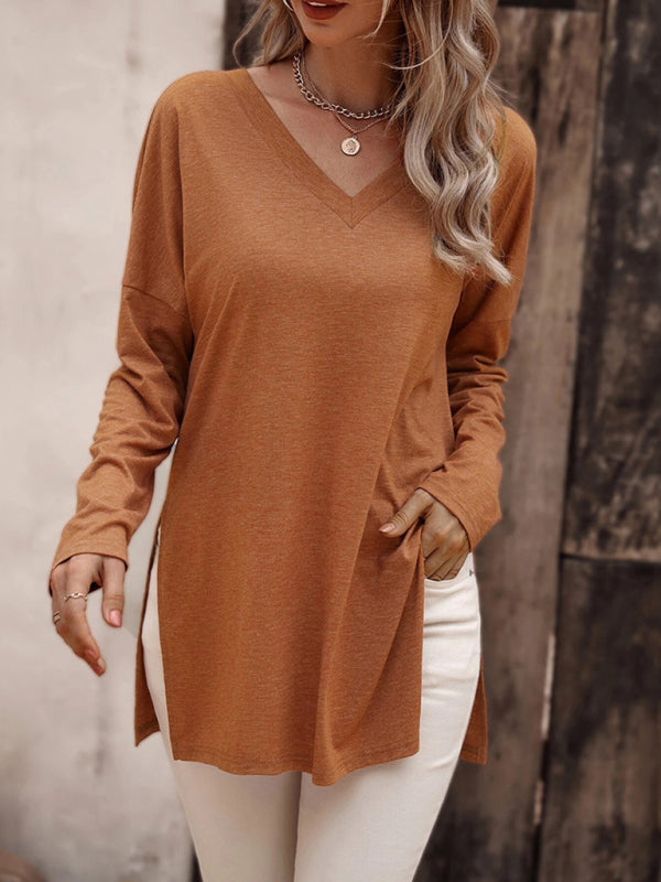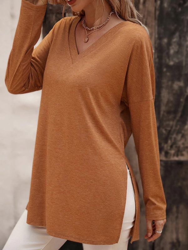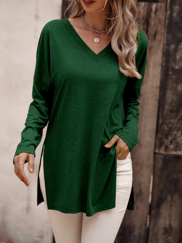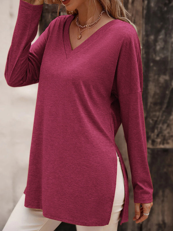 Women's Solid Color V Neck Essential Long Sleeve Side Slit Longline T- Shirt