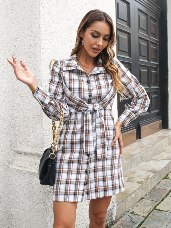 This adorable mini dress has an everyday collared button down design and a trendy plaid print. The cozy fabric of the dress is both lightweight and soft on the skin. The dress's unique puffed sleeves with a dramatic cuff and front bustier chest tie give this dress a unique elegant finish.