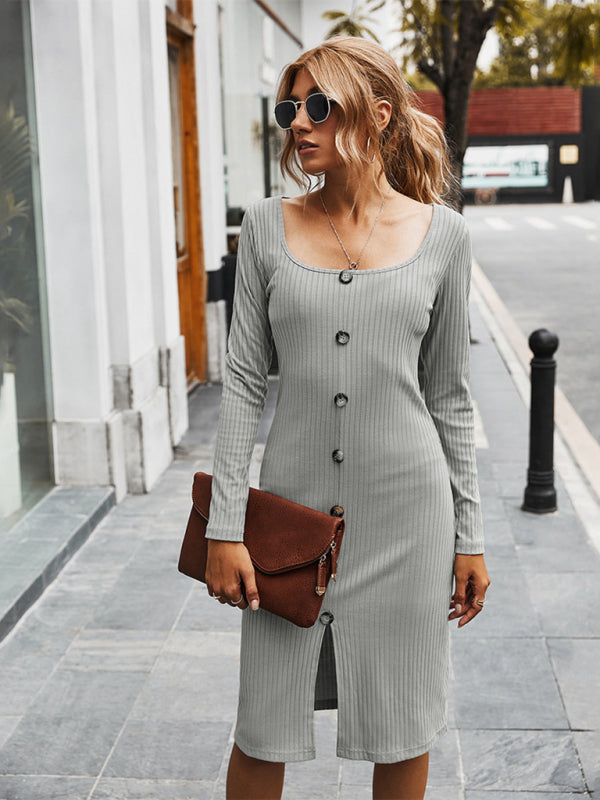 Women’s Knee-cut Bodycon Button Down Dress With Square Neckline And Fitted Sleeves