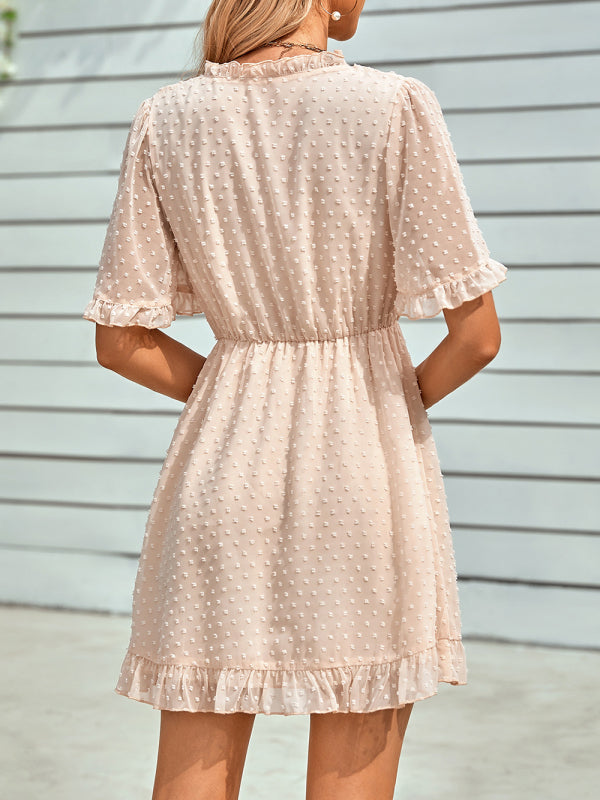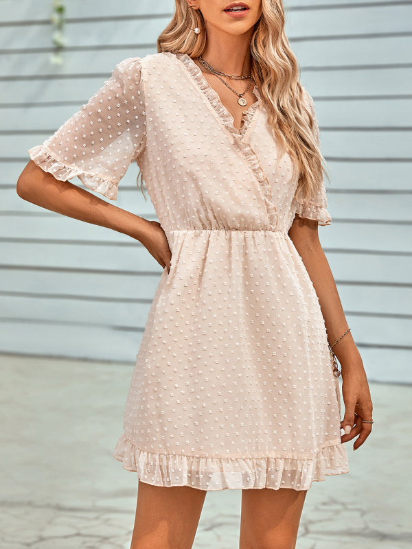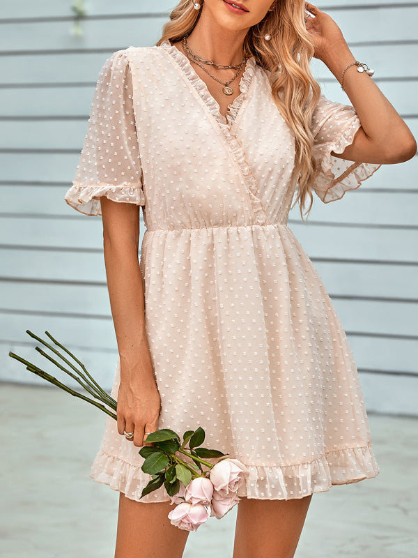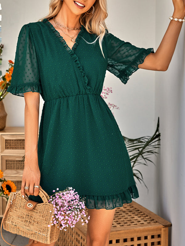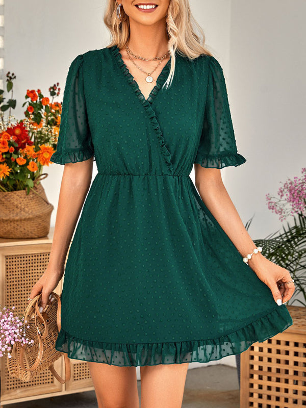 Women's Solid Color Ruffle Clip Dot Ruffle Sleeve Mini Faux Wrap Dress