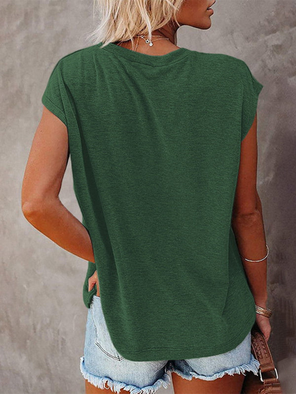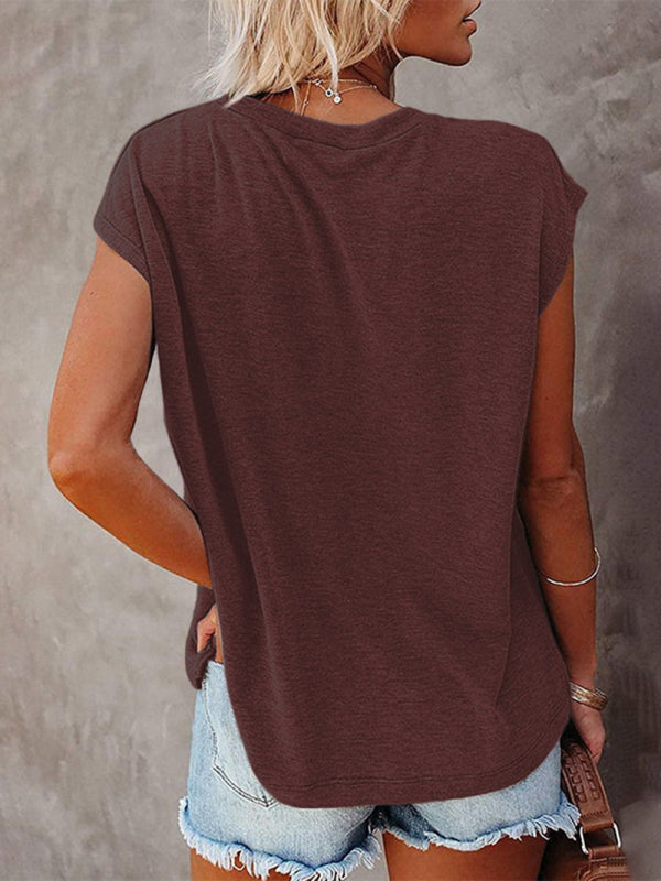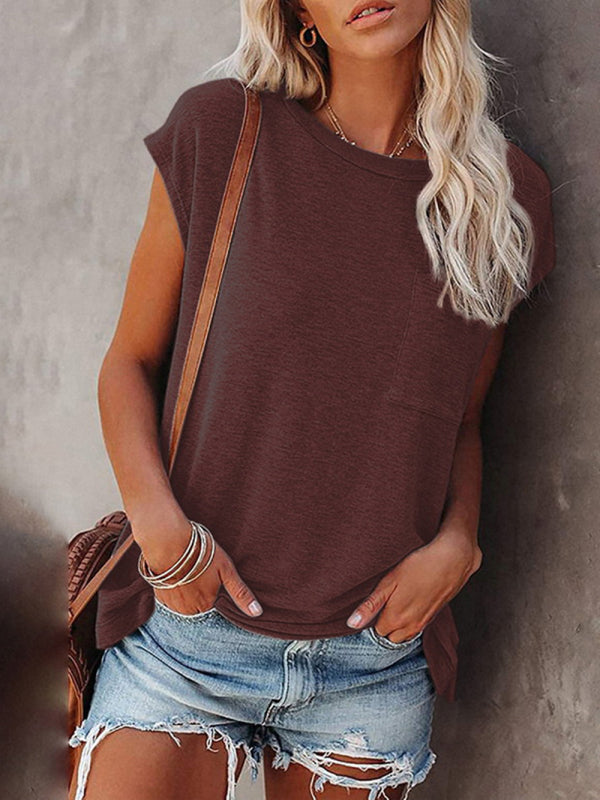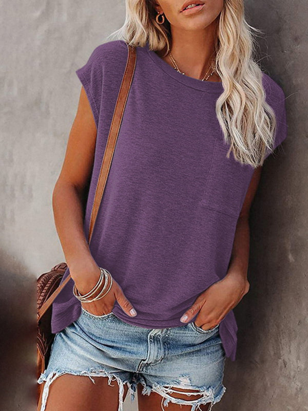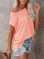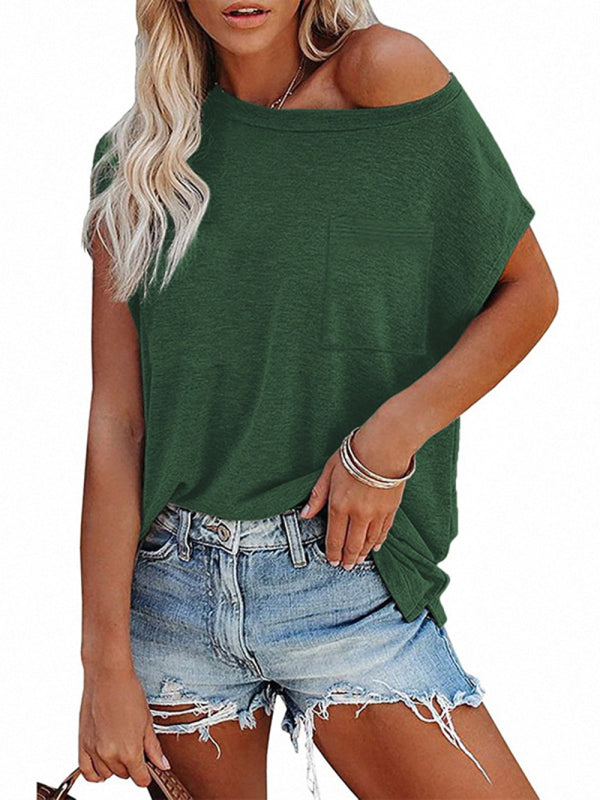 Women's Tops Solid Color Pocket Off Shoulder Round Neck Short Sleeve Women's T-Shirt
