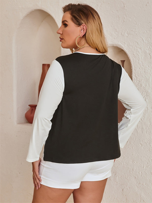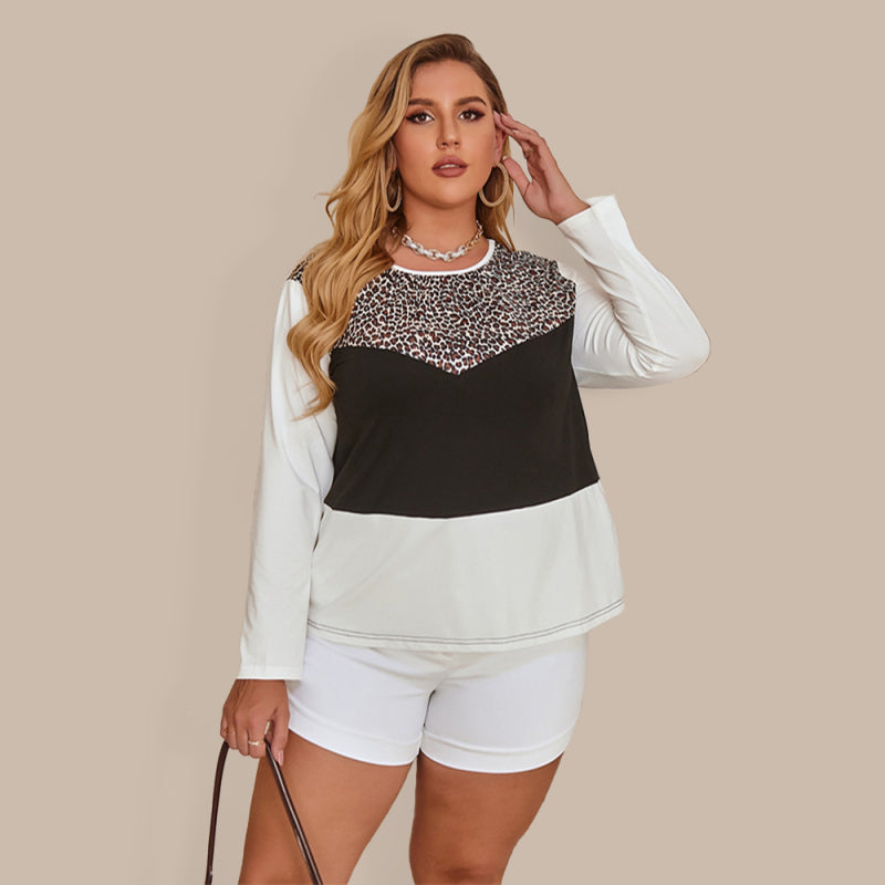 Women’s Plus Size Colorblock Faux Leopard Print At Chest Crew Neck Top