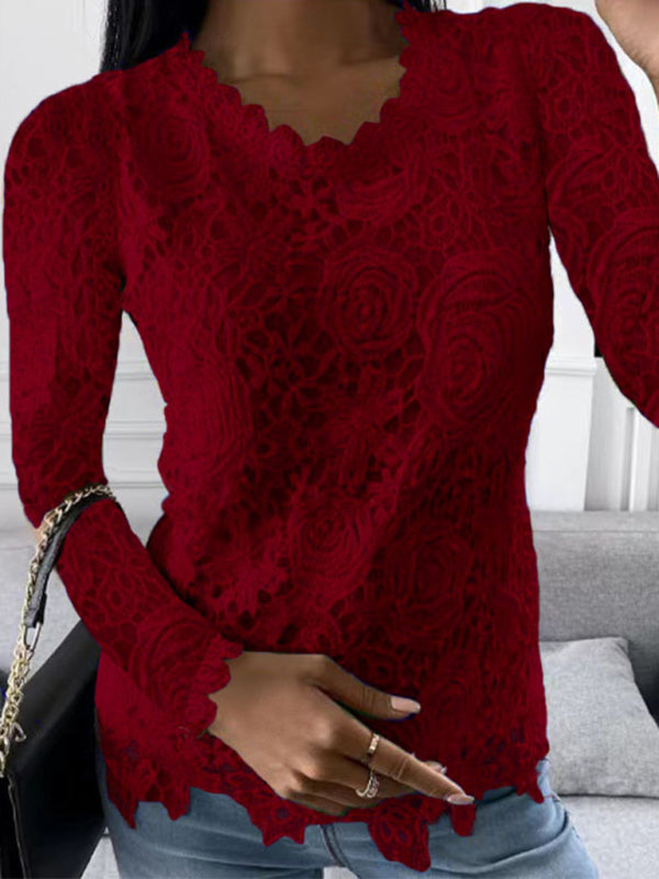 Women’s Solid Color Scoop Neckline Overlay Lace Long Sleeve Blouse