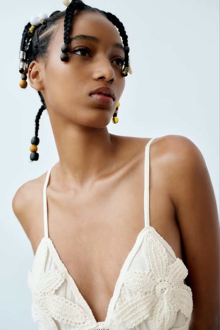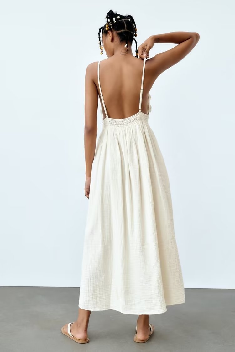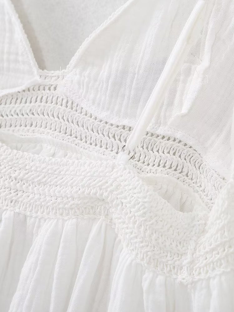 Women Same Color Stitching Crochet Decoration Adjustable Spaghetti Strap V neck Strap Dress - XS / White is backordered and will ship as soon as it is back in stock.