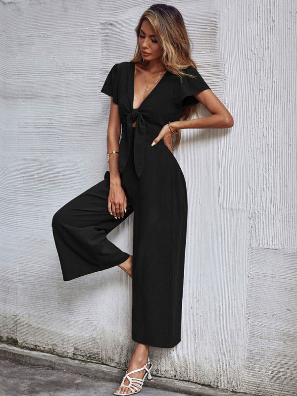 Women's Solid Color Tie Front Cutout Flutter Sleeve Crop Jumpsuit