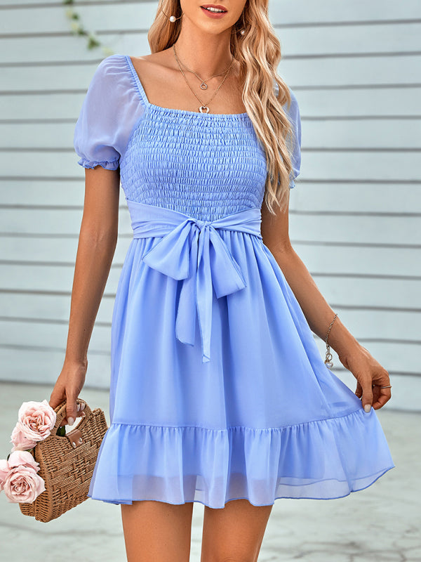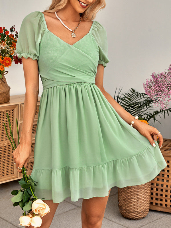 Women's spring and summer V-neck solid color waist short-sleeved dress